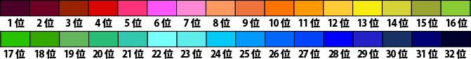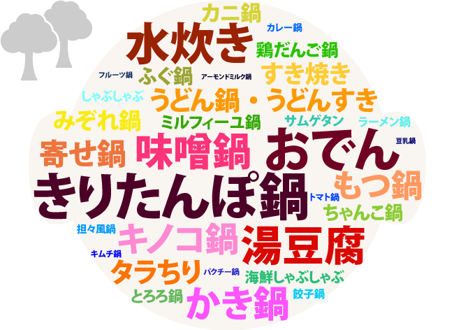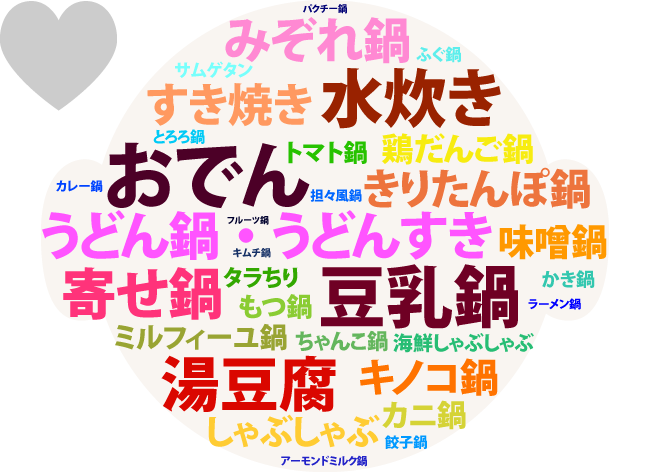 32種類の鍋のランキングを「文字の大きさ」と「色」で表しました。(順位が高い程、文字が大きく赤みが強い。)