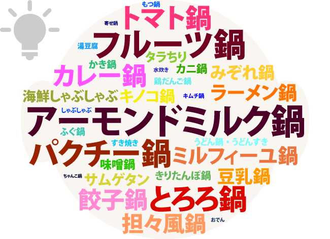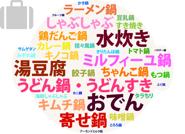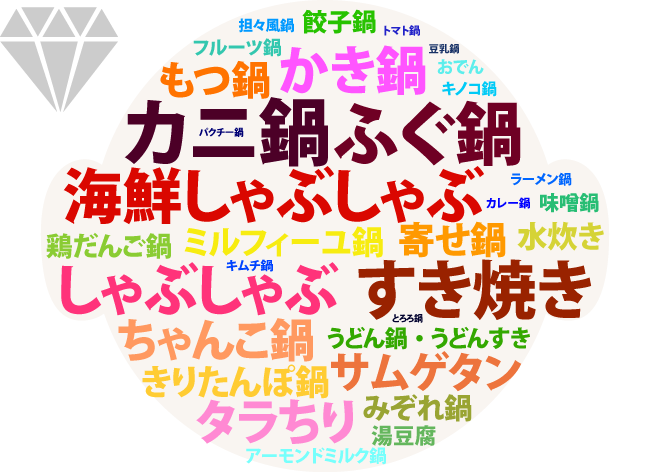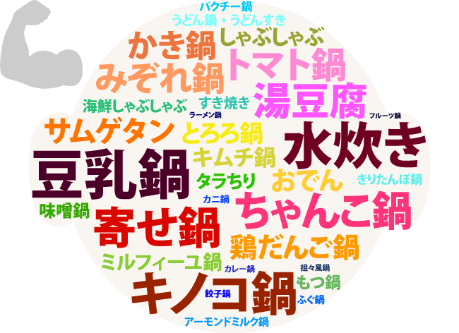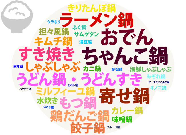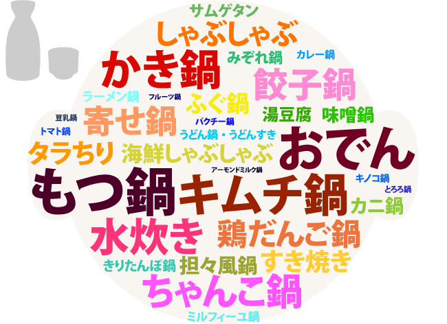 32種類の鍋:「アーモンドミルク鍋」「うどん鍋・うどんすき」「おでん」「海鮮しゃぶしゃぶ」「かき鍋」「カニ鍋」「カレー鍋」「キノコ鍋」「キムチ鍋」「餃子鍋」「きりたんぽ鍋」「サムゲタン」「しゃぶしゃぶ」「すき焼き」「タラちり」「担々風鍋」「ちゃんこ鍋」「豆乳鍋」「トマト鍋」「鶏だんご鍋」「とろろ鍋」「パクチー鍋」「ふぐ鍋」「フルーツ鍋」「水炊き」「味噌鍋」「みぞれ鍋」「ミルフィーユ鍋」「もつ鍋」「寄せ鍋」「湯豆腐」「ラーメン鍋」
