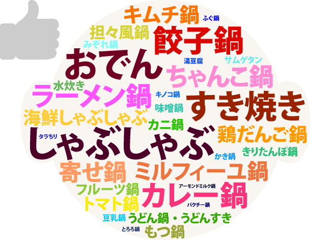(%) 1 おでん 18.4 2 豆乳鍋 10.7 3 水炊き 9.0 4 湯豆腐 8.2 5 寄せ鍋 6.8 6 うどん鍋・うどんすき 6.1 7 みぞれ鍋 5.9 8 すき焼き 5.6 8 きりたんぽ鍋 5.6 8 キノコ鍋 5.6 8 味噌鍋 5.6 12 しゃぶしゃぶ 5.3 13 鶏だんご鍋 5.1 14 カニ鍋 4.4 15 ミルフィーユ鍋 4.0 16 もつ鍋 3.7 16 トマト鍋 3.7 18 タラちり 3.6 19 ちゃんこ鍋 3.5 19 海鮮しゃぶしゃぶ 3.5 21 かき鍋 3.4 21 サムゲタン 3.4 23 ふぐ鍋 3.3 24 とろろ鍋 3.2 25 餃子鍋 2.9 26 担々風鍋 2.8 27 カレー鍋 2.7 28 ラーメン鍋 2.6 29 アーモンドミルク鍋 2.0 30 キムチ鍋 1.9 31 パクチー鍋 1.3 32 フルーツ鍋 1.1 -