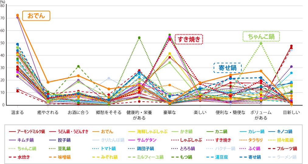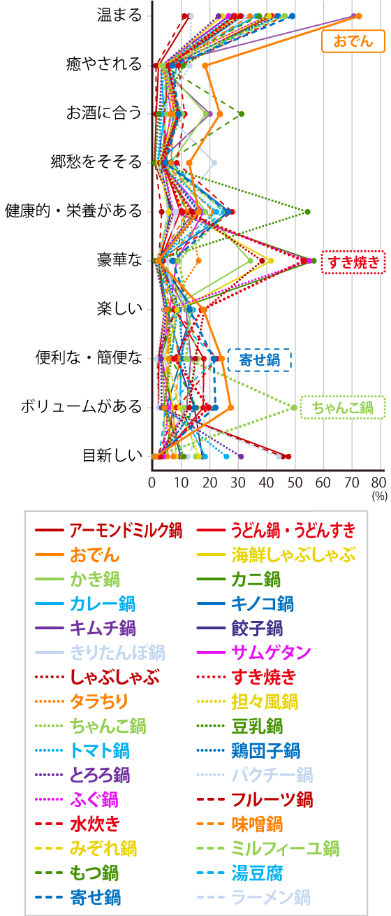 各イメージを横軸に、それぞれの鍋のポイントを縦軸に、折れ線で表しました。高い数値で推移しているのは、「おでん」「すき焼き」「ちゃんこ鍋」「寄せ鍋」などです。