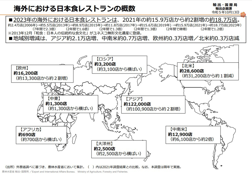 また、海外における日本食の人気も、以下マップの日本食レストラン概数の通り、2021年の約15.9万店から2023年は約2割増の約18.7万店と、日本食の人気が高まっていることがわかります。
