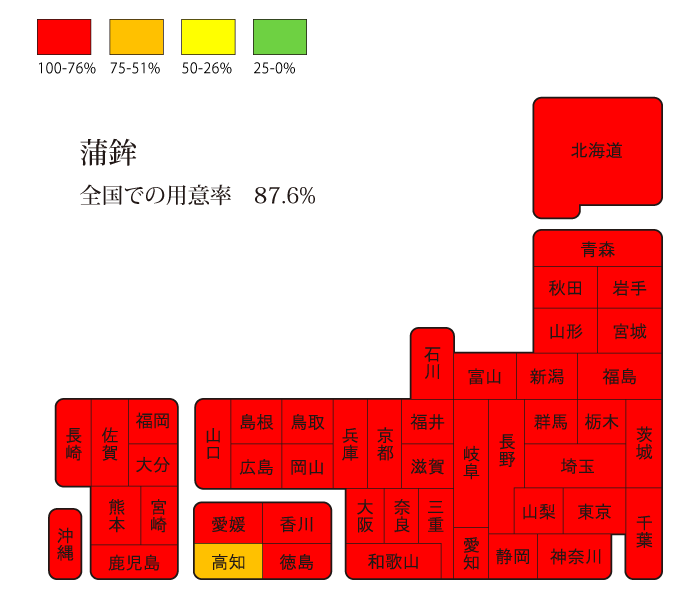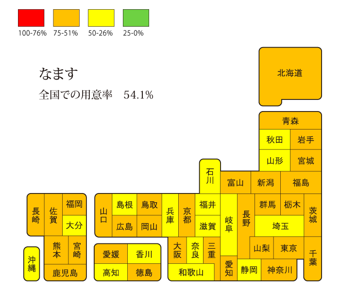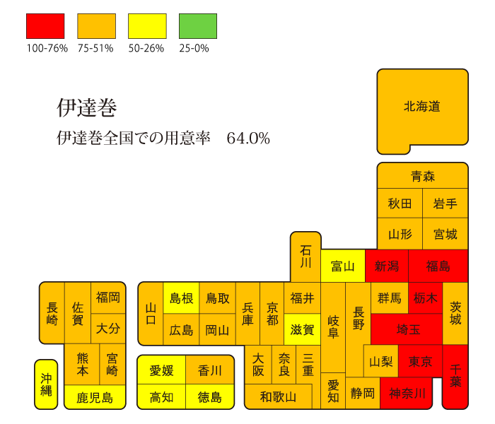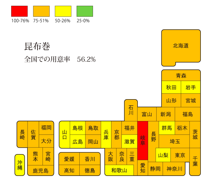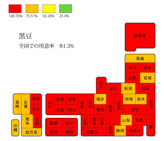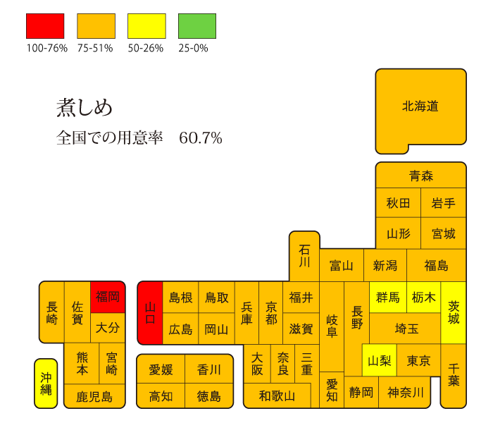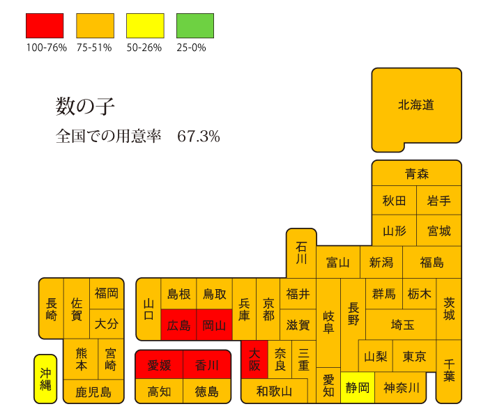1位の蒲鉾から3位の黒豆は、全国的に赤色で占め、各都道府県で用意されているようです。4位の数の子から9位のなますは、ほぼ50%を超える用意率で全国的に食されている料理と言えます。10位の田作り(ごまめ)については、西高東低の傾向が見られます。