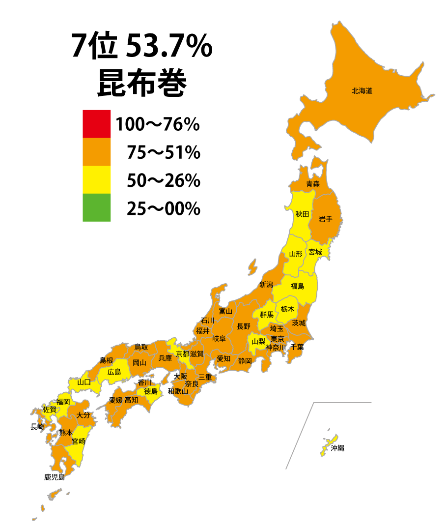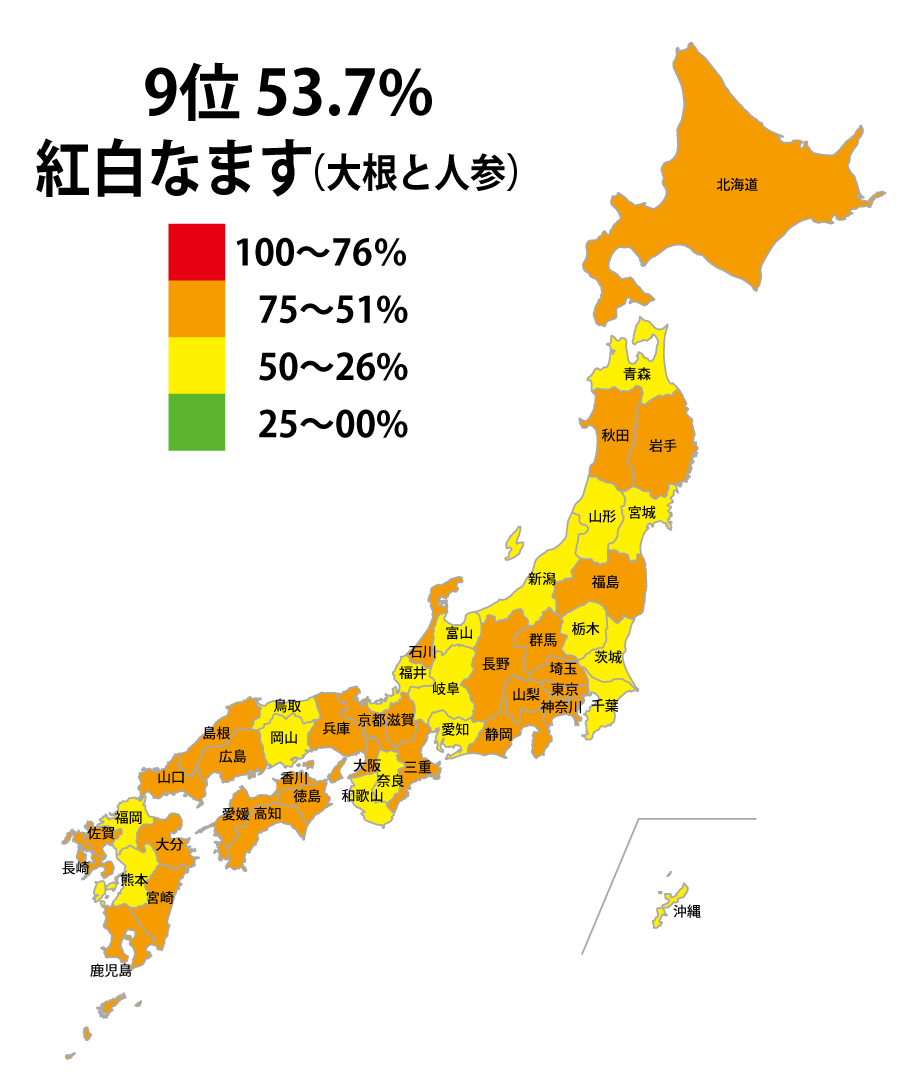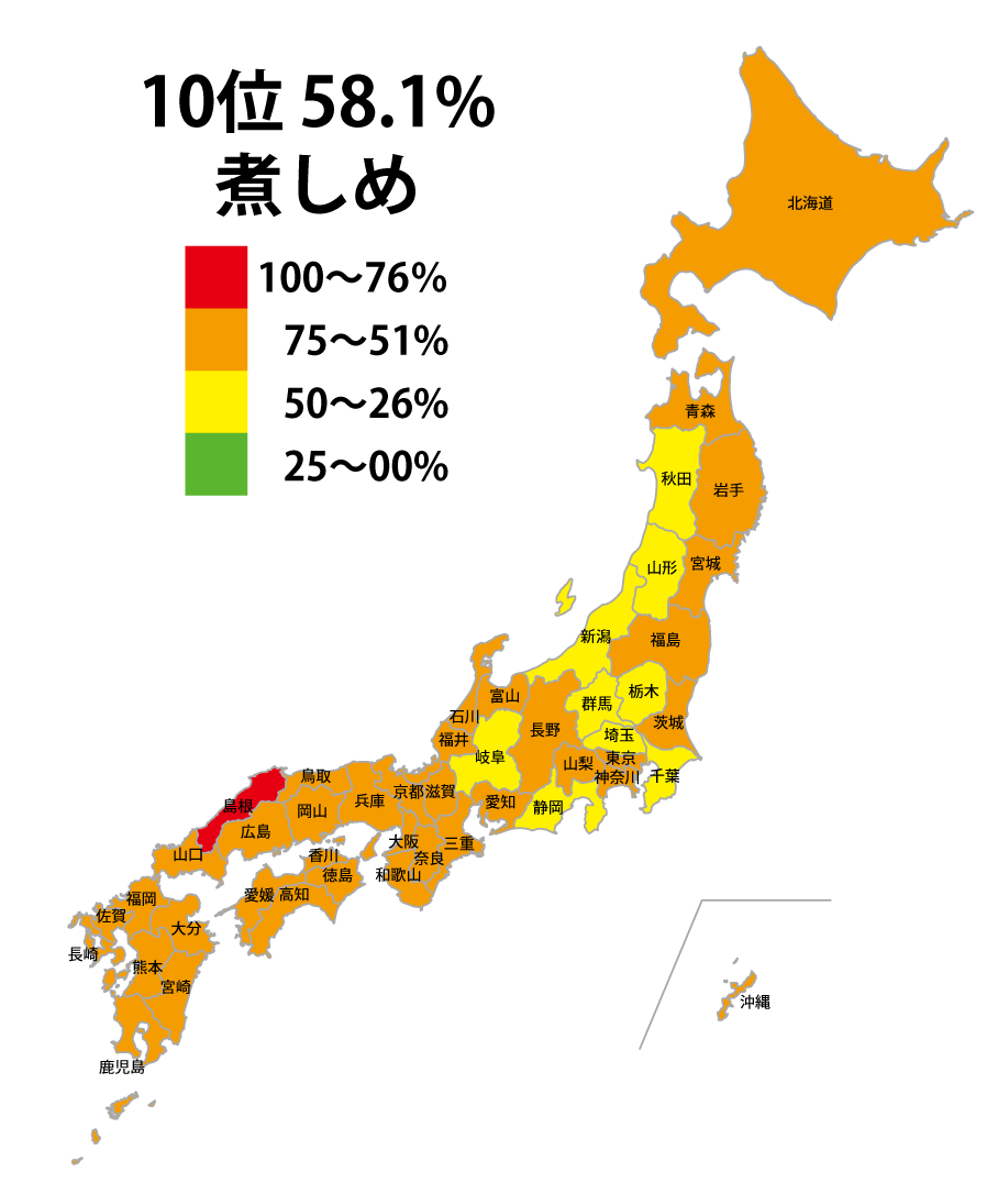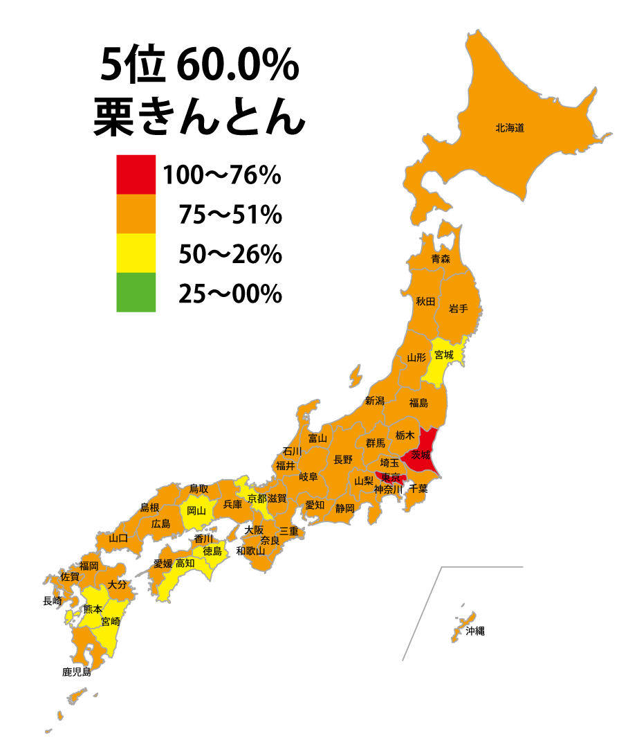 1位のかまぼこは全国的に用意率76%以上を示す赤色がほとんどで各都道府県で用意されているようです。2位の雑煮から6位の栗きんとんまで、いずれも用意率は60%を超えており、全国的に食されているおせち料理と言えます。