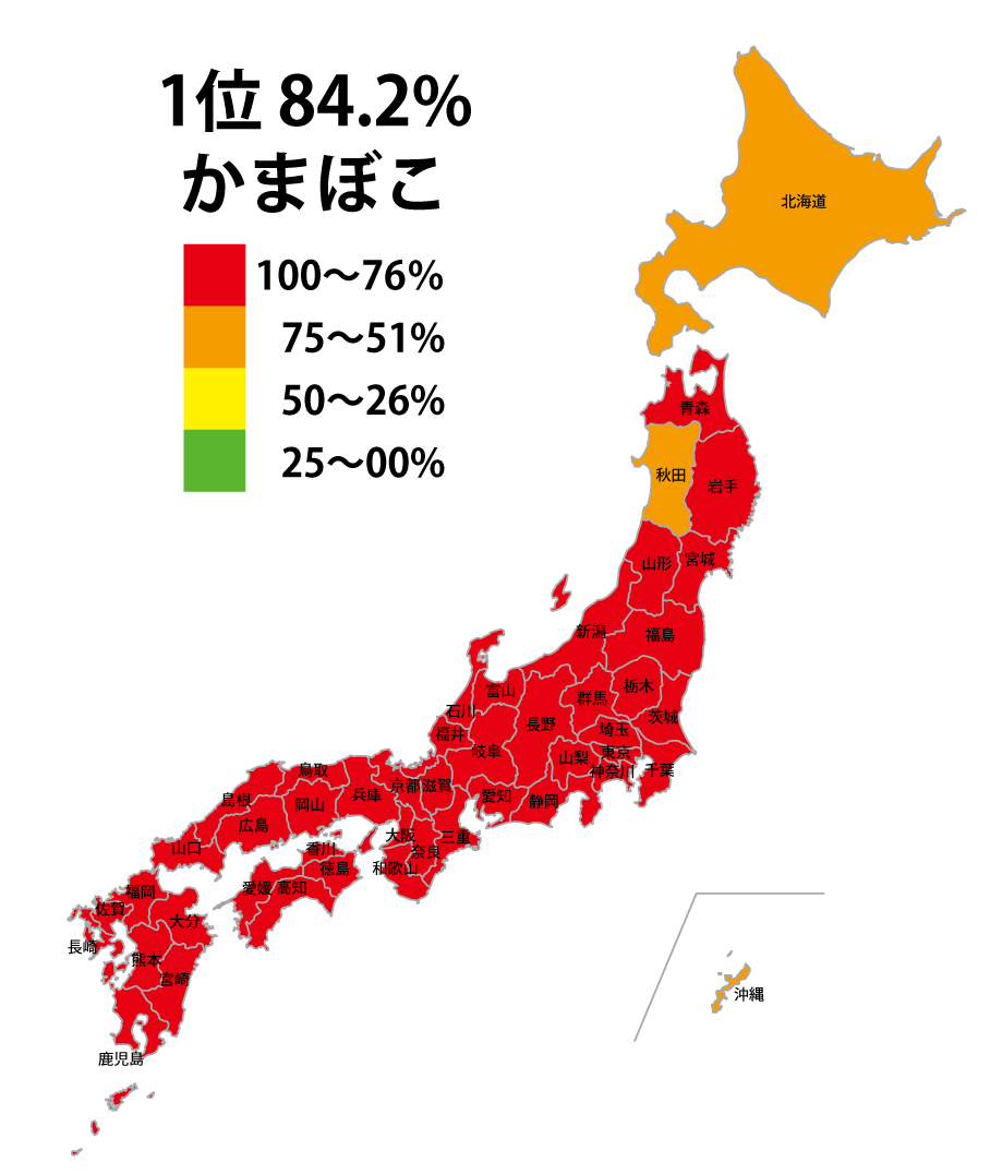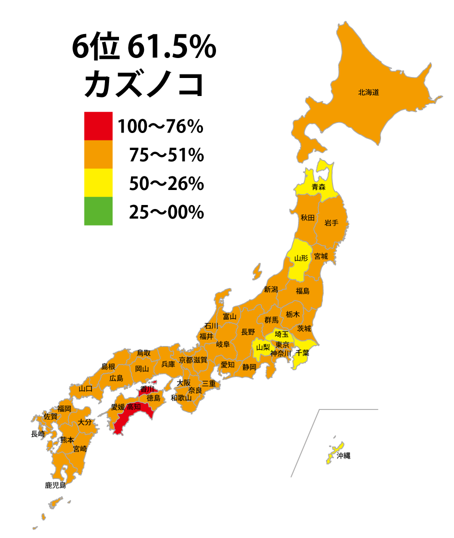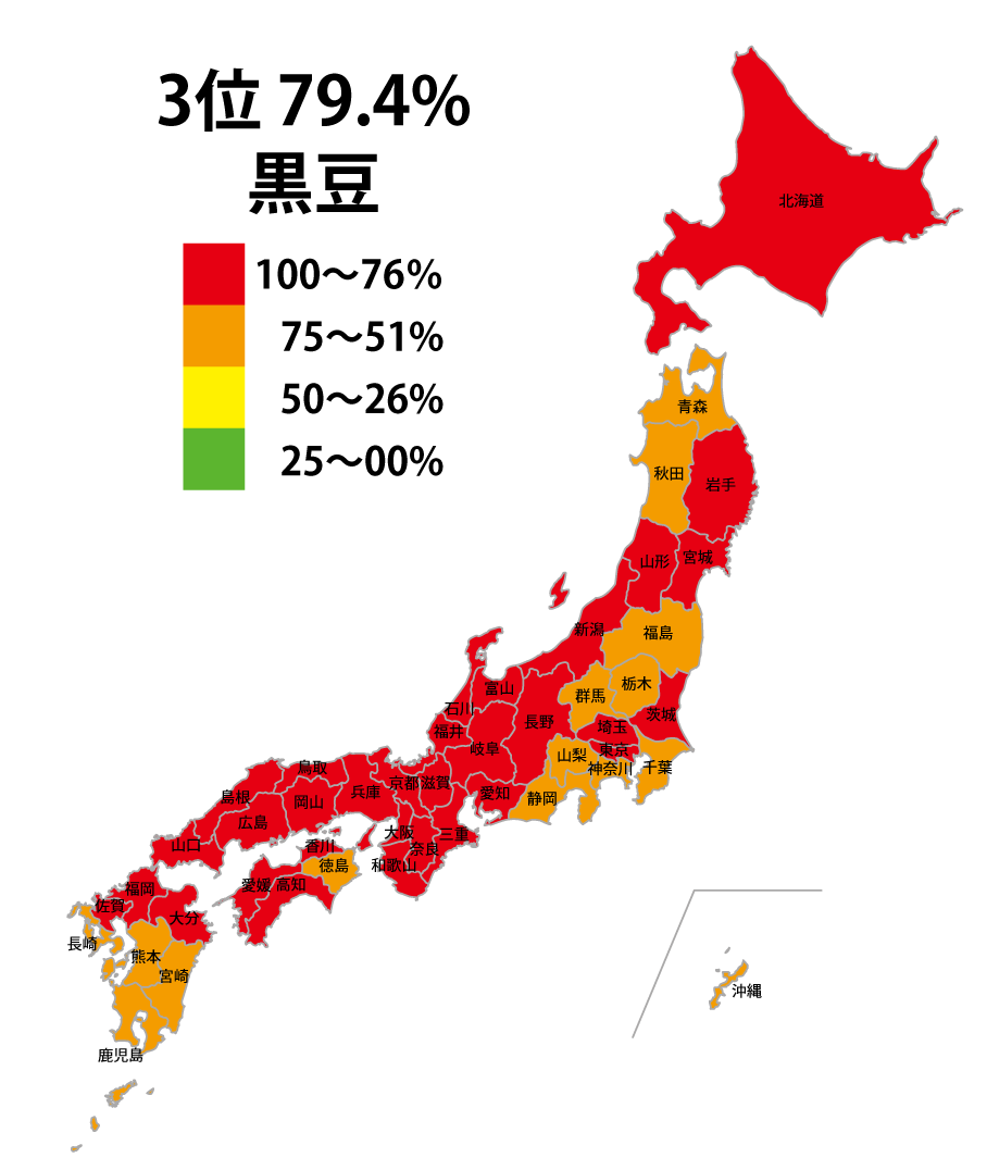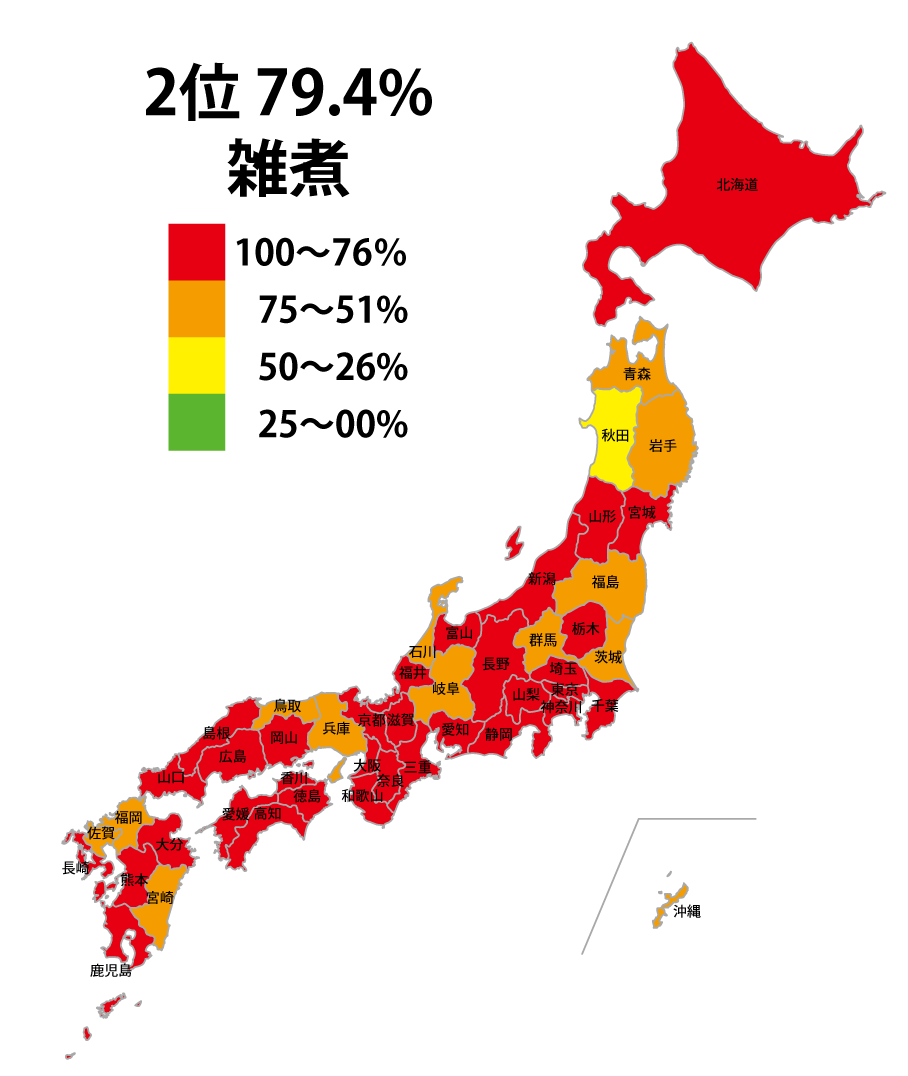 1位のかまぼこは全国的に用意率76%以上を示す赤色がほとんどで各都道府県で用意されているようです。2位の雑煮から6位の栗きんとんまで、いずれも用意率は60%を超えており、全国的に食されているおせち料理と言えます。