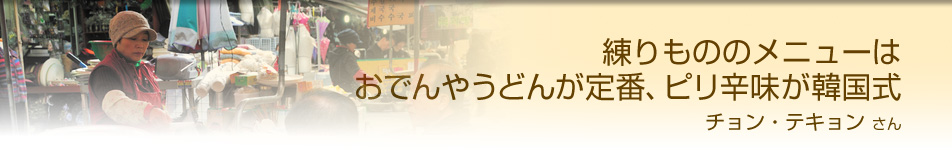 日本は今、韓流ブームと言われていますが、韓国でも日本の文化に触れる機会はどんどん増えてきていて、とくに、日本食はレストランや屋台など、さまざまな場所で食べることができるようになっています。なかでも、屋台などの手軽に食事ができる店では、おでんやそばなど、ファストフード感覚で食べられる日本食がそのままの名前で並んでいるのを見かけます。