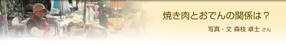 寒い夜、制服姿の学生たちや、勤め帰りのサラリーマンが露店でこの竹串のおでんを食べています。店のおばちゃんが、紙コップにあつあつの汁を注いでくれて、それを飲みながら……。醤油をちょっとつける人もいます。