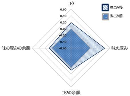 「魚河岸あげ®」をIH調理器具にて10分間煮こみ、煮こむ前の練り物と合わせて、味認識装置にて測定、分析した。