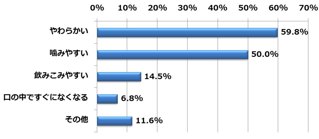 ⇒「やわらかい」59.8%がトップ、次いで「噛みやすい」50.0%