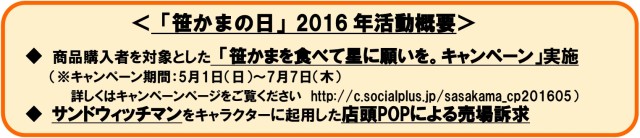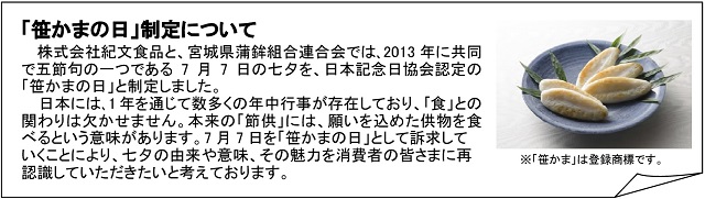 株式会社紀文食品では、7月7日「笹かまの日」の応援サポーターとして、お笑いコンビ「サンドウィッチマン」を起用。全国における紀文食品の「笹かま」商品の店頭POPや特設サイトなどに登場し、商品をPRします。