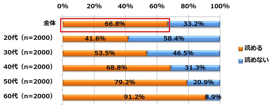 「魚河岸」という漢字を「うおがし」と正しく読むことができるか聞いたところ、全体では66.8%の方が「読める」と回答しました。年代別で見てみると、20代では「読める」と回答した方が41.6%だったのに対して、60代では91.2%となり、年代が上がるにつれて読める割合が高くなることが分かりました。