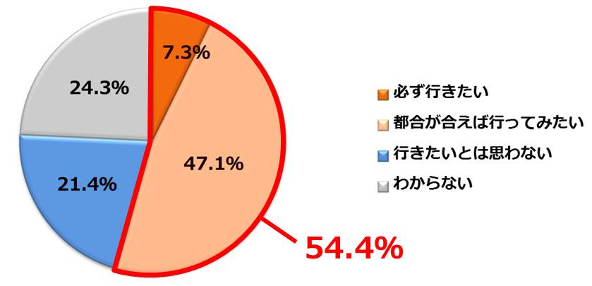 「築地中央卸売市場」が豊洲へ移転する前に築地へ行ってみたいか聞いたところ、全体では、「必ず行きたい」「都合が合えば行ってみたい」合わせて54.4%の方が行ってみたいと回答しました。前問では築地の移転を知らない方が3割以上いましたが、半数以上の方が行ってみたいと思っていることが分かりました。