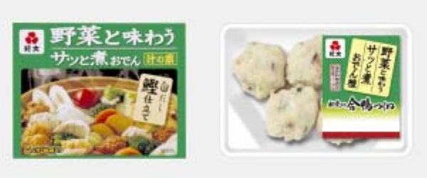 おでんは、「作り置きができる」、「家族が集う時にも、個食対応にも合う」など、忙しい主婦にも評価の高いメニューですが、「もっと野菜が食べたい」「彩りが欲しい」などの声がありました。この「野菜と味わうサッと煮おでん」シリーズは、こうしたニーズに応えて開発したもので、グリーンのパッケージで統一、新コンセプトを色で表現しました。