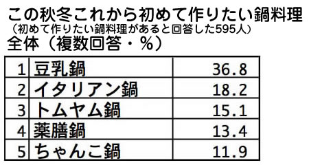 この秋冬これから初めて作りたい鍋料理について、作りたい鍋料理があると答えた595人に聞いたところ、「豆乳鍋」が36.8%と、昨年にひき続き1位でした。健康志向が強まる中、ヘルシーな豆乳を使った鍋に、主婦の注目が集まっているようです。以下、2位「イタリアン鍋」18.2%、3位「トムヤム鍋」15.1%、4位「薬膳鍋」13.4%、5位「ちゃんこ鍋」11.9%と続きます。