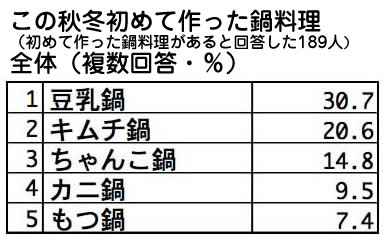 さらに、実際にこの秋冬に初めて作った鍋料理があると答えた189人中でも、「豆乳鍋」が30.7%と1位となりました。次いで、2位「キムチ鍋」20.6%、3位「ちゃんこ鍋」14.8%、4位「カニ鍋」9.5%、5位「もつ鍋」7.4%となっています。