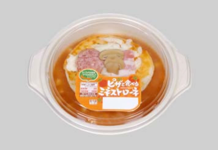 電子レンジで温めるとゼラチン状に固められたミネストローネが溶け、その上に乗っているピザに熱々のミネストローネが染み込んでいく、新しいスタイルのスープ総菜です。濃厚なトマトスープとピザがベストマッチの、今までになかったおいしさです。