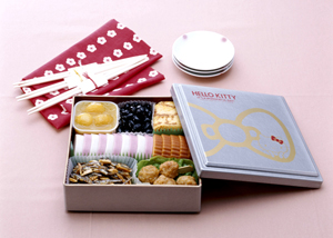 今年は、定番の蒲鉾(紅・白)と伊達巻に加え、子どもに人気のおせちを中心に、玉子焼、栗きんとん、アーモンド入りの田作り、黒豆、地鶏のつくね串の計7種8品を用意しました。重箱には、正月らしいおめでたい銀色を基調に、金色でハローキティのイラストをあしらっています。また、ハローキティが年中行事を紹介する「はろうきてぃオリジナルミニカレンダー」が付いています。