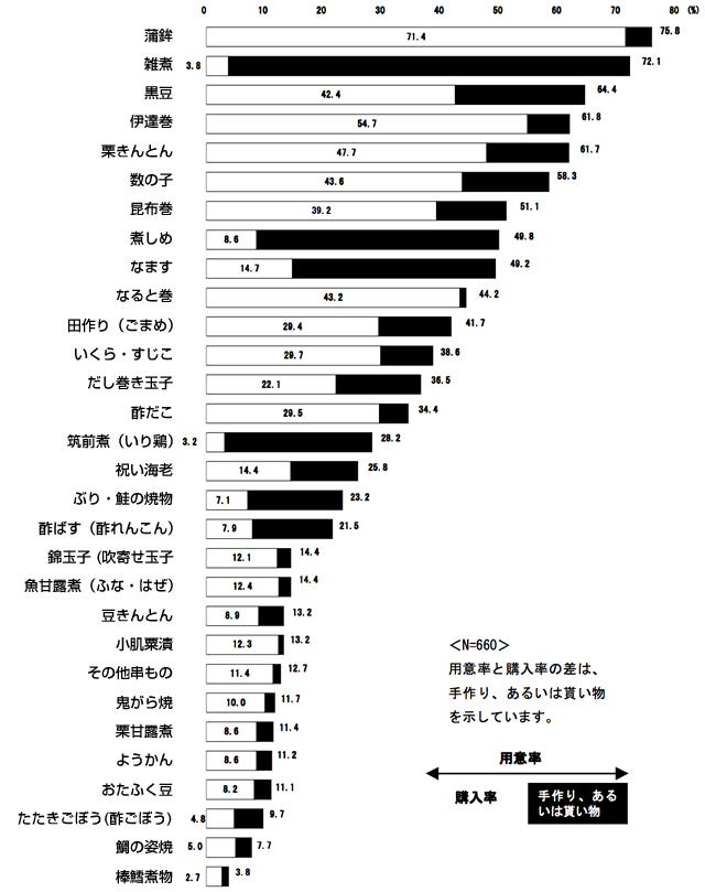 用意したアイテムの 1 位は「蒲鉾」75.8%、2 位「雑煮」72.1%、3 位「黒豆」64.4%、4位「伊達巻」61.8%、5 位「栗きんとん」61.7%、6 位「数の子」58.3%、7 位「昆布巻」51.1%、8位「煮しめ」49.8%、9 位「なます」49.2%、10 位「なると巻」44.2%で、以下は「田作り(ごまめ)」「いくら・すじこ」「だし巻・厚焼玉子」「酢だこ」「筑前煮(いり鶏)」「祝い海老」「ぶり・鮭の焼物」が続きます。