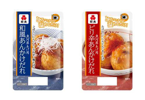 さらに、主要商品の「魚河岸あげ プレーン」は、特長であるソフトでクリーミーな食感を、よりなめらかにおいしくリニューアルしました。加えて、専用のあんかけだれ「魚河岸あげ用 和風あんかけだれ」「魚河岸あげ用 ピリ辛あんかけだれ」の2 品を新たに発売します。魚河岸あげにかけて温めるだけと、手軽なレンジ調理で簡単にひと手間かけたようなおかずができあがります。