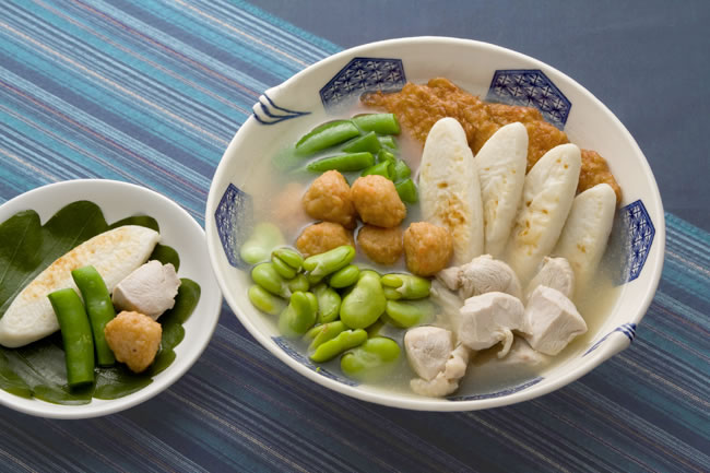 - 3. 鶏肉はひと口大に切る。野菜てんぷら、笹かま、揚ボール、鶏肉を霜降りする。