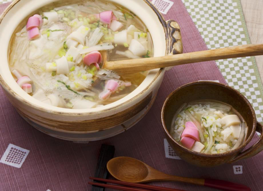 ほのかな塩加減と魚のうまみがある蒲鉾は、やさしい味わいの雑炊と良く合います。蒲鉾を紅白二色にして、暮れのおめでたい雰囲気を演出しました。このような細工ができるのも弾力のある蒲鉾ならでは。魚をさばく必要もなく、そのおいしさが楽しめるという練り製品の特長を生かした献立です。練り製品は調理の手間がかからない便利な食材。せっかくの便利なものを使わないのはもったいない。日本が誇る伝統の食材を、日々の料理にもっと活用してみてください。