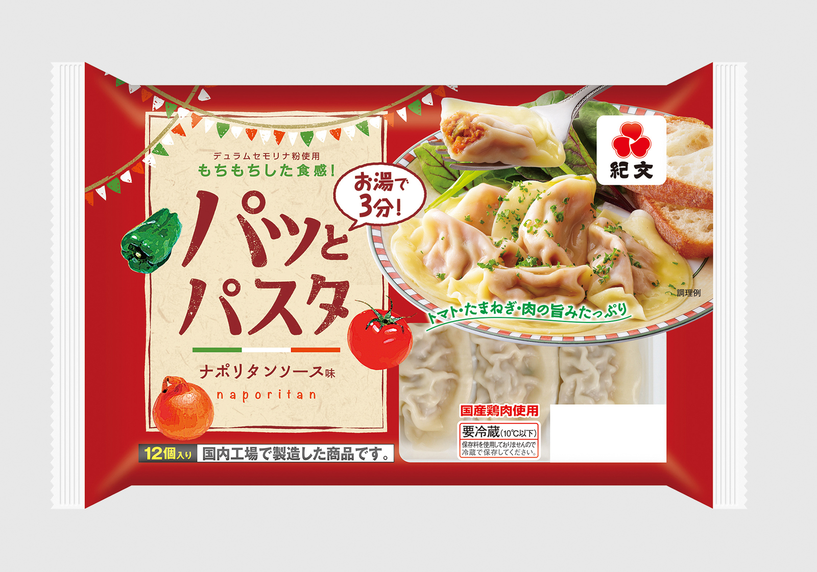 「パッとパスタ ナポリタンソース味」は、ソース仕立ての具材をパスタ生地で包み込んだ、“お湯で3分”の簡単調理が特長のチルド商品です。皮には、デュラムセモリナ粉を配合し、コシのあるモチモチした食感に仕あげました。子どもから大人まで人気のナポリタンソースに、玉ねぎやピーマンなどを加え、野菜の旨みたっぷりに仕あげました。具材にしっかりと味がついているので、そのままでも召しあがれますし、パルメザンチーズやお好みのスパイスなどをかけてアレンジも楽しめます。