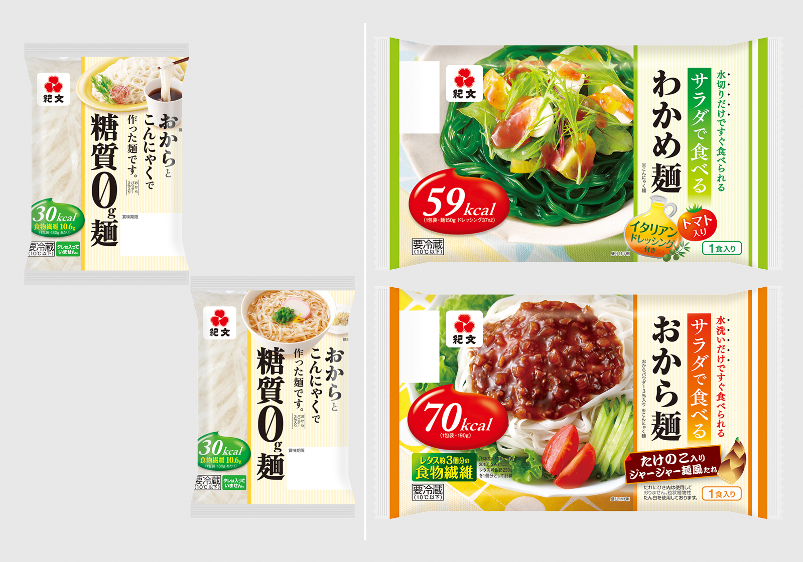 株式会社紀文食品では、「糖質0g麺」、「サラダで食べるわかめ麺」、「サラダで食べるおから麺」を、2月24日(月)より、全国でリニューアル発売します。