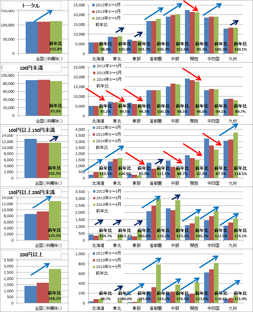 各年の価格帯別 累計販売個数・前年比 ※エリア区分は紀文食品の支店エリア定義に基づく