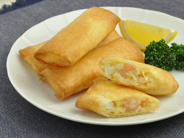 - 4春巻きの皮で、3を1個ずつ包み、包み終わりに同量の水(分量外)で溶いた小麦粉を塗ってとめる。残りも同様に巻く。