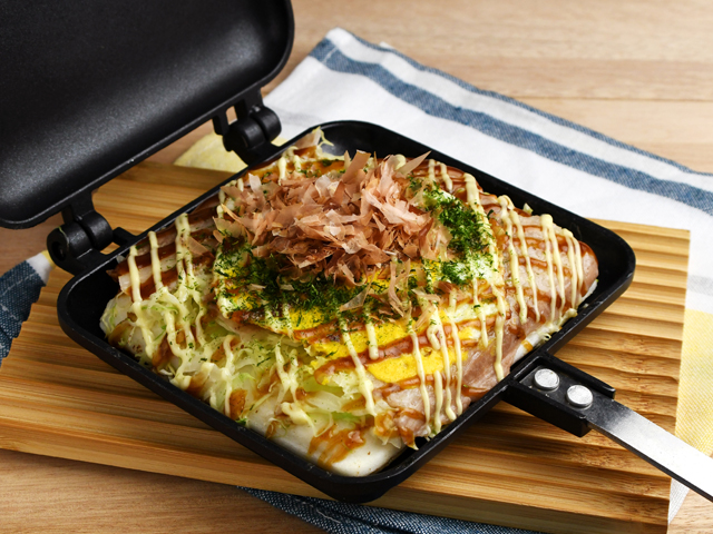ホットプレートで作る場合は、具材をそれぞれ焼いて、最後に重ねてソースなどをかけると短時間で作ることができます。