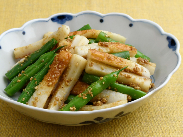 ちくわのしなやかな弾力とさやいんげんのシャキッとした食感がよく合うあえ物です。