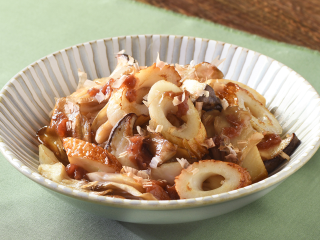 - 43に梅干しを加え、梅干しをつぶしながら炒め、種を取り出す。Aを加えさっと炒める。