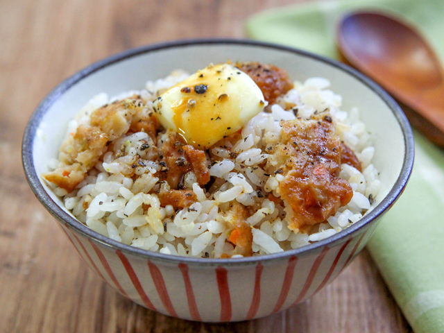 - 32にバター10gを加え、野菜てんぷらをしゃもじで大きめにほぐしながら混ぜ、塩とこしょうで味を調える。