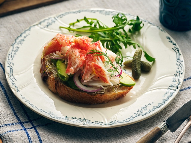 - 3カンパーニュにクリームチーズを塗り、スプラウト、アボカド、紫玉ねぎをのせる。さらにThe SURIMIをのせて、オリーブオイルと粗びき黒こしょうをかける。