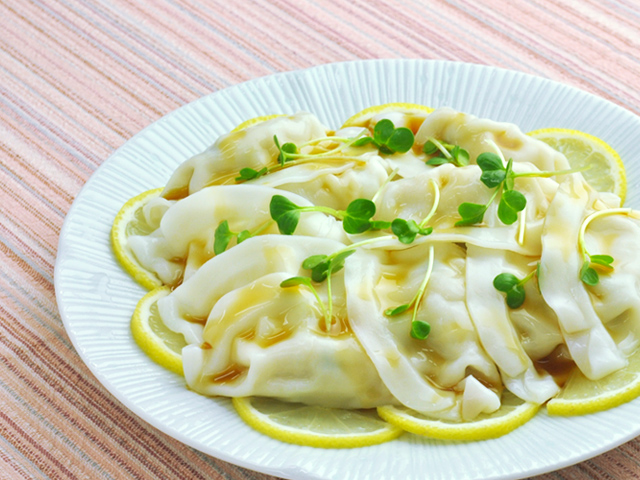 冷たくした水餃子にレモンの酸味と香りがさわやかで、夏向きなひと品です。