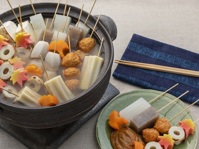 - 3鍋に湯をわかし、揚ボール、焼ちくわ、焼豆腐、紅葉麩、ちくわぶをそれぞれ入れ、30秒ほどしたらざるに取り出す。(この調理法を霜降りと言う。) その後、材料すべてを串に刺す。
