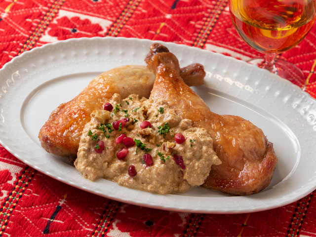 - 6ローストした鶏肉に5をかけて、砕いた飾りのくるみ、ざくろの実、パセリを散らす。