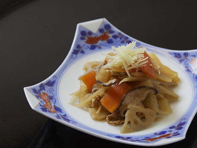 具材の大根、にんじん、ごぼうなどを、砂糖、しょうゆ、酢の調味料で煮た料理。なますを煮ることで優しい味に仕上がります。