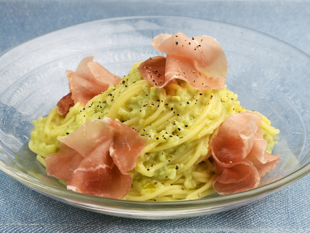 - 43を2のソースとからめ器に盛り、生ハムをのせ粗びき黒こしょうをかける。