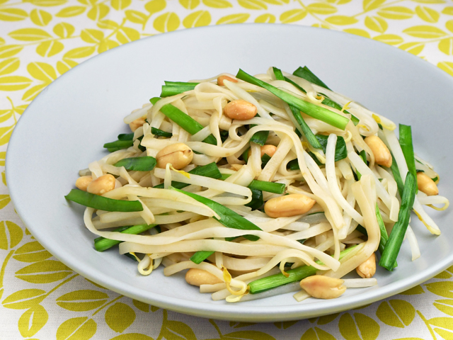 - 3フライパンに1を入れ、からいりして水分をとばし、もやしとごま油を加え炒める。もやしが透き通ってきたら、にらとピーナッツを加えさっと炒める。