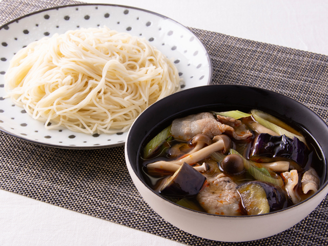 豚肉のうま味とラー油の辛味が効いたつけ汁でいただく、具だくさんでボリュームたっぷりのつけ麺風です。