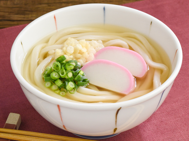 - 43に蒲鉾、小ねぎ、揚げ玉をトッピングする。
